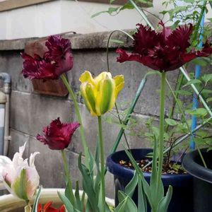先日 病気かな?と言ってた実家のチューリップ これはパーロット咲きというものらしいです 先日の写真の黄色と赤のは 気持ち悪すぎてチョキン✂️したとのこと💦 今はこれが咲いてました
