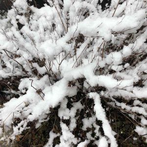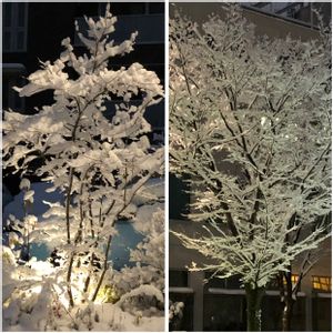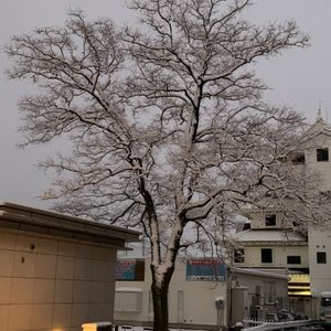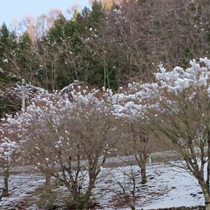おはようございます😃 昨日の朝、6時です。 まだ、雪が舞っています。 日の出前、道路は早い出勤の車がライトを点けて、ノロノロと走っています。 夜には少し吹雪いたのかもしれません。 木の幹にも雪が張り付いています。 雪国の人達には申し訳ありませんが、滅多に見られない雪景色に、子供のようにワクワクしました。 葉っぱの落ちた木の枝に積もった雪はまるで白い花のようです。 横の公衆トイレのライトで、ライトアップ。 日が出るまで、雪国気分を味わいました。😁