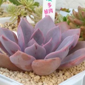 目があったpots対応の交配種さん 名無し(紫系のアルバらしい)×シャビアナハイブリッド うちわみたいな形に肉厚な葉っぱ、どういう色形になっていくんだろうな〜