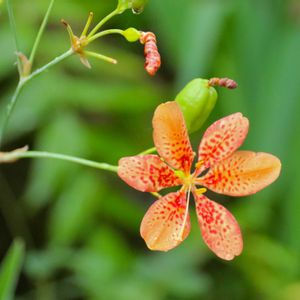 ヒオウギ (アヤメ科) 山野の草地や海岸に自生する多年草。葉は長く扇状に広がり宮廷人が持つ檜扇に似ていることから この名がついたそうな。 花は8月頃に咲き、花被片はオレンジ色で赤い斑点があり、放射線状に開く一日花。 日本では青森県以南 四国 九州 沖縄に分布するとか。 高知県立牧野植物園にて撮影📷