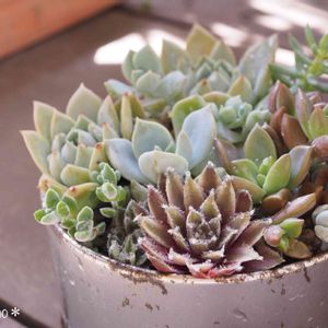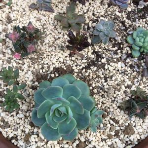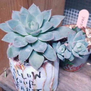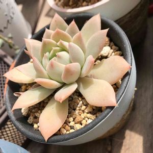 エケベリア系の鉢 カクトロコの札にはエケベリア属って書いてあるけど、ネットで見るとエケベリアと他の交配種って書いてあるところもあるからよくわからない…🌱