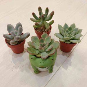 キッチンカウンターに置いている、チビ多肉たちです🌵 憧れの『恋心』(カエルくんの後ろ)をお迎えできて嬉しいです🥰 今は別々の鉢植えですが、可愛く寄せ植えしたいです!