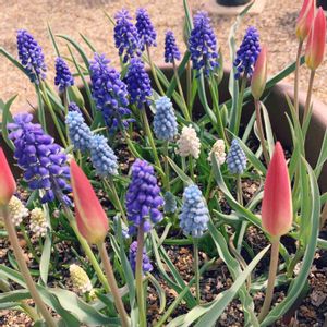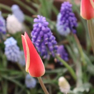 どっちが先❓ ミニチューリップの蕾が大きくなりました。フリージアの蕾も大きくなりました。クロッカス、アネモネ、ムスカリ、チューリップに続く5番手はどっちかな❓