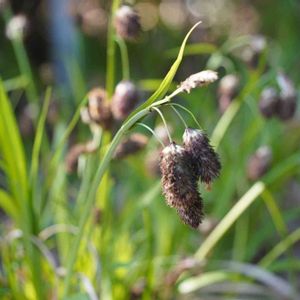 狸蘭 タヌキラン カヤツリグサ科 スゲ属 花期 5〜7月 分布 北海道南部〜本州中部地方 以北 花期 5〜7月 山地の湿った岩場に生える多年草 葉 幅0.5〜1cm 縁はざらつく 花 茎先に小穂を 3〜6つける 上部の1〜3個は雄性で披針 形 下部の2〜4個は雌性で長さ 2〜4cmの広楕円形、細長い 柄で垂れ下がる 雌鱗片は黒褐色で披針形、 先端には短い芒がある