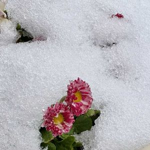 また積もりました⛄️ デイジー🌸が気を吐いて⁉️ 顔を出しています🥲 (ビオラは雪の中) 雪は雨に変わって、❄️→☂️ 午後には陽がさすがも☀️ あと少し 👍