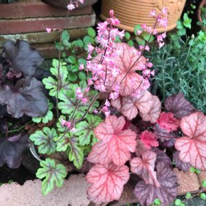 ヒューケラだと思ってたら、1つだけヒューケレラだつた😳その1つから小さなお花が咲きましたꕤ୭*ꕤ୭*ꕤ୭* ヒューケラも、新しい葉っぱが出てきてモリモリになってきた◝(⑅•ᴗ•⑅)◜..°♡