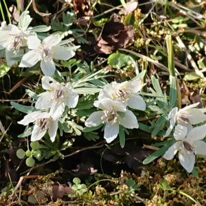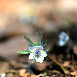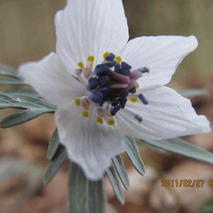 自然観察園にて 節分草(セツブンソウ) あまり良く写せませんでしたが、来年まで見られないので、捨てるのが惜しく… この花は咢片が7、8枚あるみたいです。
