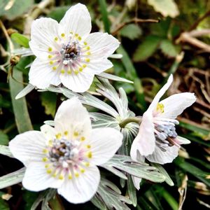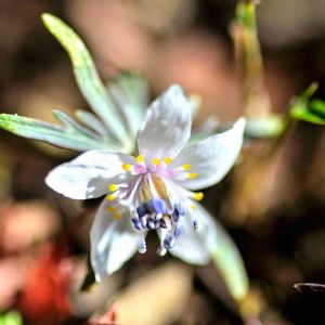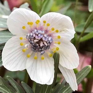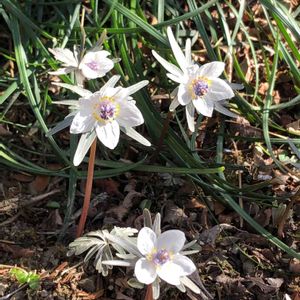 自然観察園にて 節分草 花びらに見えるのは、咢片で、黄色のポツポツが花。青いのが、雄蕊です。 雌蕊は見えにくい! 個体差色々あるそうです💠