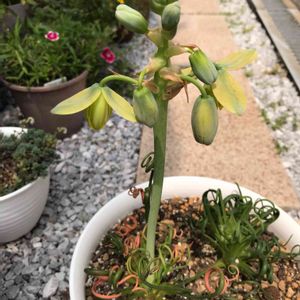 アルブカ^_^二輪目が咲いたようです(^◇^;) どうも、この状態で開花みたいです。 開花している株は、くるくる葉っぱが茶色くなってきています。休む合図でしょうか⁇ 初めての夏越しをトライちゅうなので、記録しながら観察続けます。