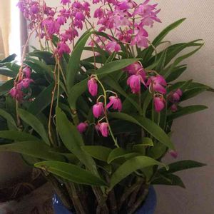 Dendrobium primulinumで、今はpolyanthumに統合された花です。花はNS6cmを超えていて、比較的大きな花が咲いたと思います。香りもスパイシーで、2015年の世界らん展の資生堂の限定香水にもなっております。 来年は50輪くらいを目指して頑張ります。
