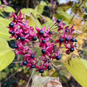 兵庫県豊岡市の玄武洞の出口にありました 鮮やかなピンク色の花びら?ガク?に黒い実 黄緑色の葉とのコントラストが目を惹きます なんという植物なんでしょうか?