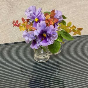 花首が 長いタイプ(ステムロング)の パンジーなので、 切花にしてみました〜💓💕 庭にある材料で、小さな アレンジに しました。。。 紅葉🍁した シモツケ ライムマウンドや ベトナムのハーブ🌿 キンゾイを 添えて❣️^_^ 今日は、風🌪️が無いので、過ごし易いですが、、、関東でも 昨夜は 最近 2度目の地震で、思ったより 揺れましたね〜‼︎💦 怖い😨ですね、多いですね〜💦