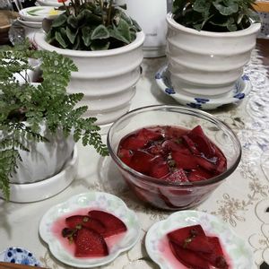 夜中 雨☔に なりました〜❗️ 昨日 農産物直売所で 芯まで赤い🔴大根に 出逢えました❣️ 甘酢漬けに しました🌸 お酢は、フレンチタラゴン🌿を 漬けた、フレンチタラゴン酢に 甘味は オリゴ糖と 茶色のお砂糖 半々です❣️ 2枚目、3枚目は コンパクトな シモツケの シモツケ ライムマウンドの 紅葉🍁です❗️ しかし、もうすぐ 落葉しちゃいます‼︎‼︎🍂 4枚目は 一昨日、庭のワイルド・ストロベリーの鉢に まだ 大きな カマキリさんが 居ましたよ‼️ 12月の中旬、、、今度 カマキリさん 見る時は、どうなってるか⁇、 近くに 産みつけた卵が ありました〜🌸