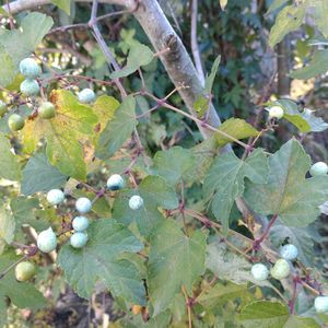 ノブドウが、色付いてきました。💞😄 毎年、この蔓をまるめて、生リースを楽しんでいます。💝 今年は、ピンク系が少く、ブルー系のリースになりそうです。🥳