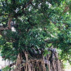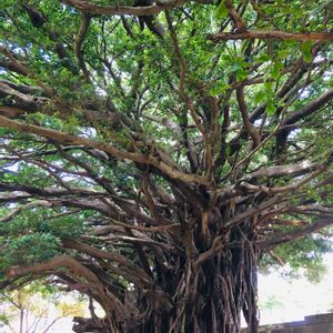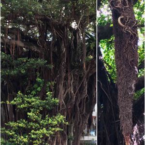 ガジュマルの木③ 昔、馬場が有ったとされる琉球松並木の先端にあるガジュマルの木 (今ではこんな所に馬場があったんだ〜‼︎ と😳) 付近に小学校が有り歩道の一角に有るためか、気根を伸ばすのを許されず、太い幹を中心に垂れ下がっては切られた(?) 多数の気根がまるでドレッドヘアのようになってます😅 私の大好きなガジュマルの木①②③でした🌳鉢植えの可愛いガジュマルも好きです💕