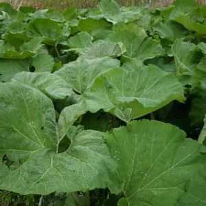 秋田ふき すみません、大きさの比較の為、 葉の上に、青いゴム手袋を 置きました。 まだまだ大きくなります😊