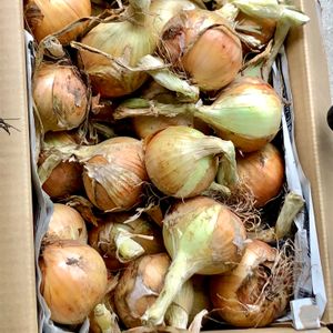 ふふふ…(๑╹ω╹๑ ) 埼玉の親戚から届いた📦 新玉ねぎザマス✨ヽ(´▽`)/ 血液サラサラ〜生で🥗炒めて・煮て❣️ 味噌汁の具としても好きだワ😍 有り難い(*´꒳`*)