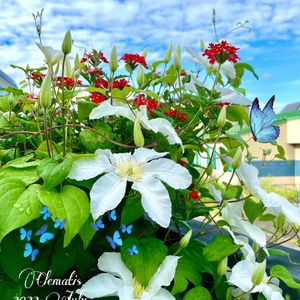 白いクレマチスが咲きました🍃🎶 赤の花手毬のプランタースタンドに絡まって カッテニコラボ⸜(*ˊᗜˋ*)⸝です🌸 クレマチスは、地植えなんですよ〜 植えて4年目になります❀.(*´▽`*)❀. 今朝の雲💭が綺麗でした・*:..。o♬*゚・*:o♬ 朝の光はブルーで涼しげでしょう?🍃