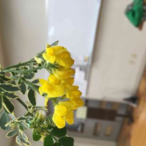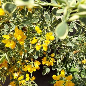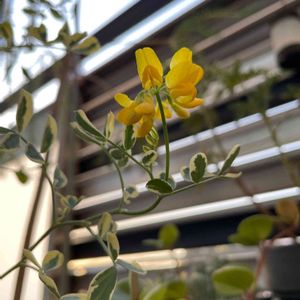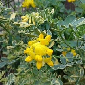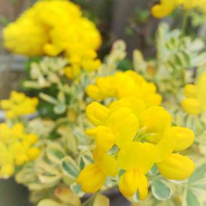 おはようございます😃 この黄色いお花に惹かれて✨ 昨年お迎えした斑入りエニシダ 長い名前は コロニラ・バレンチナ・バリエガータ💛 ブラキカムの鉢で咲き始めました🎶 葉っぱも綺麗です🌿✨🌿✨