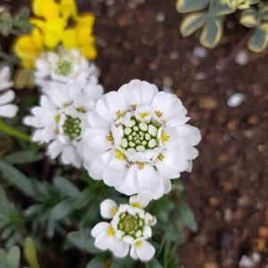 今日のお花イベリス🌼 2021.3.12撮影 「小花が集合した純白の可憐なお花で、4枚の花弁は外側の2枚が大きく、内側の2枚が小さい花が集まってできています。 こんなに小さな花が密集しているのに、花弁が重ならないように配列されている様(さま)に完璧な自然の美を感じます。」 『LOVEGREEN』サイトより引用 その他の名前:トキワナズナ、マガリバナ(屈曲花)、トキワマガリバナ、キャンディタフト アブラナ科マガリバナ属(イベリス属)