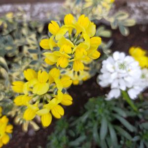 コロニラ・バレンチナ・バリエガータ (流通名)斑入りエニシダ・パピー マメ科コロニラ属 コロニラは黄色い蓮華のような花。 しなやかな花茎の先に直径2㎝程度のマメの花の集合体を咲かせます。 『LOVEGREEN』サイトより引用 右の白い花は今日のお花、イベリスです🌼