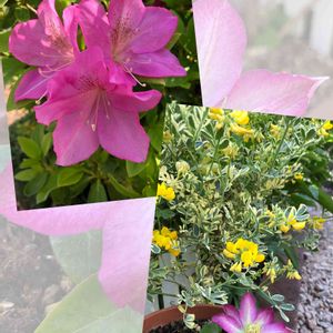 こんばんは🌇 上はツツジの1番花。 下は去年、迎えたクレマチス麻王を地植えから鉢植えに植え替えてツルも伸びずに花だけ咲きました💖 1年中リーフを楽しめるコロニラバレンティナバリエガーターに黄色の花が咲きました🌼