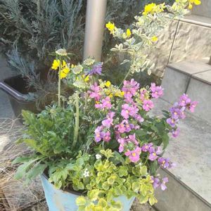 スカビオサ、プリムラ、バコパ、コロニラ、ジャスミン。紫💜と黄色💛の寄植えです。 中央にジャスミンが隠れています。まだ背が低いので見えません🤭💓