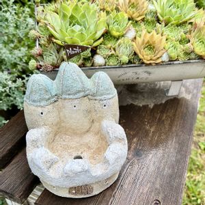 (。・д・)ノオハヨー♪ゴザイマス☔️ 数年前にタニ友さんから頂いた モルタルリメ鉢🏠🍀✨ お家付きの可愛い鉢です😄👍 ほとんど外に居るので若干…苔🟢生えてきたけど💦 得意のセンスなしの色々植えも 鉢のおかげで可愛くなってるかな💕