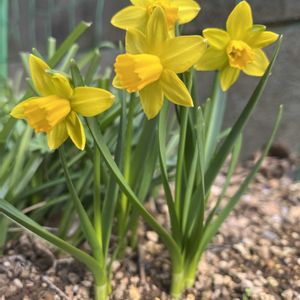ちょっと😯 みんな向こう向いて、うつむいて 何話してるの〜😳⁉️ いつの間にか庭でこんなに咲いてた💛 ミニ水仙 テータテート(だと思う🤭) ➡️覗いてみた🫣 咲いてることに気付かなかった 家主の悪口かもね😂 テータテート💛 フランス語でナイショ話っていう意味なんだって🤭
