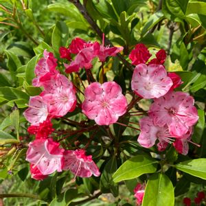 カルミア🌸 コンペイトウの形をして色の濃い蕾がとても可愛いです💕初めて見た時は感激しました(*゚∀゚*) 和名 セイヨウシャクナゲ・アメリカシャ クナゲ 原産 北アメリカ東部 ツツジ科 カルミア属 葉は有毒 羊殺しという恐ろしい名前あり 酸性土壌で生育