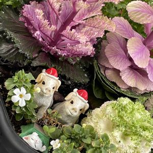 3/9㈰⑥ 🏷ヒーリングカラー ラストはミニ葉牡丹です🤗 💚💜💜💜💚 今日神代植物公園の梅園の遅咲きの梅の花を観に行きました☺️ 年パス様様です!! で、帰りは深大寺の方へ出てバスに乗りました。 もう16:30過ぎたので閉店したお蕎麦屋さんの前の寄せ植えです!! 可愛かったです😍ミニ葉牡丹は寄せ植えも良いですね〜〜❣️❣️ 紅い花はギョリュウバイ、細い葉は糸水仙かな?右側に黄色い咲き終わった花が見えます👀 白い小さな花はなんでしょうね? Googleさんはアキレアプタルミカだと判定しましたが……よくわかりません😅