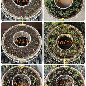 こんにちは😊 ミニ葉牡丹の成長を少しだけ|ω•˘ ) ① 25.09.28(日)〰️ 25.10.03(金) 種まきから11日でこれだけ芽が出るのですね〜🌱🌱 ② 横からショット📸 週末はお天気が悪くなるみたいで屋根の下に移動(•ω•`*)))))トコトコ 雨風で乱れないように…(*-🙏🏻-)ナムー 🏷️ ミニ葉牡丹育て隊