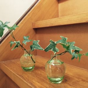 3月末から水栽培してる斑入りのアイビー。 写真右のうねり具合がお気に入り。水栽培なのによく成長するので、写真を撮るたび大きくなってるのが楽しい。 元は、むかし母が祖母から貰って植えたものの切れ端なので、親子三代 継承したことになる。盆栽みたい。