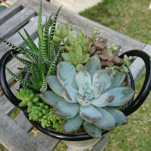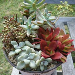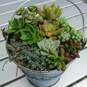 残り少ない休日は… やっぱり🌱多肉さん😄 しかし⤵今日は失敗ばかり💦 ようやく仕立て直した寄せ植えをひっくり返したり💦💦😢 葉や茎を折ってしまったり💦💦😓 残念なことばかりだったので😅 気を取り直して🙋 爽やかな風に吹かれて☕coffeeタイムに なりました😅 picは先日の寄せ植え😊 🌱レディジア🌱白牡丹🌱黄麗 🌱姫星美人🌱南十字星 🌱ビアホップ🌱虹の玉…… 七色の寄せ植えです☺