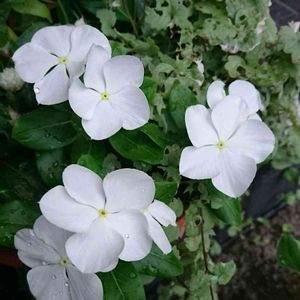 🌱日日草🌱連投します🙏 真っ白のもいいですね〜🙆 後ろに写ったグレコマの葉が 小さなバッタたちによって😓 虫食い状態になっています😅 これもまた ご愛敬…💦💦😅