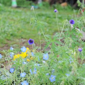 こんばんは^^ 写真は、今朝の写真です。 「カンパニュラ*ベルズブルーさんを探せ!」状態です^^;; 沢山のゲラニューム*オリオンに囲まれた、 カンパニュラ*ベルズブルーを探してみてください^^