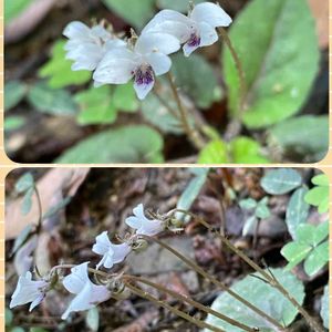 コミヤマスミレ初めましてです。いっぱい咲いていました❣️見せてくださった方に感謝です。スミレの中で最も暗い環境で生育するそうです。花も葉もとても上品で大好きになりました。高尾山の最期を飾るスミレに相応しいと思いました4/29高尾山 メモ📝 ▪️花色は白で花弁の幅は狭い ▪️花はツボスミレより一回り大きい感じ ▪️上弁は立たずに側弁に近づく ▪️萼片が有毛で反り返る❗️ ▪️葉は卵形で基部は心形、割と大きめ ▪️私が見たものは葉脈に沿って紅い斑が入っていたが、葉の表面は変化が大きい