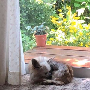 「ここ、ボクの指定席なんだよね〜♪今日もお昼寝で忙しいワン」🐕歳とって最近おとなしいから、時々起こして歩かせます。