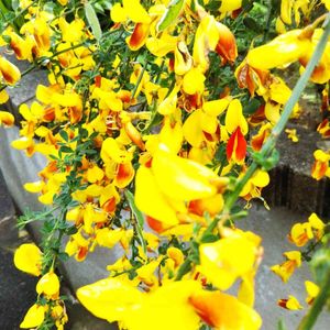 【万葉の中庭シリーズ:春の色々編】 ♡Flowers Collaboration series ♧セッコク:石斛:Sekkoku//Japanese dendrobium ♧エニシダ(ヒメエニシダ) ♡この写真画像は、セッコクとエニシダのコラボレーションの様子を撮影したものデス😸 台座は、大きな杉の木の根っこの部分を加工してベンチ代わりのモニュメントにしているものデスが、時々、室内や軒下の鉢植えの花などを日光浴させたり、雨風にうたせたりするのに利用しています。 雨の上がったあとなので、年輪が雨に濡れたのでくっきりと観えるように写っていますデスら😸 直前の投稿は、白い色のセッコクで3個の花でしたが、こちらは薄い黄色系の色をして、2つの花と1個の花蕾がついています。 傍やバックで咲いているのは、「エニシダ(ヒメエニシダ)」の鉢植えの花デス🌼 *その他、セッコクと同じ鉢にある若葉の植物は名も分からない、伸び放題の雑草の類いデス😸 この鉢植えのエニシダは、まばらに咲いていますが、たくさん咲いていたのをドライフラワーにする為に、剪定した後の様子デスら😸 @エニシダ(ヒメエニシダ) 学名 Cytisus ×spachiana 和名 ヒメエニシダ 英名 ブルーム 科名 マメ科 属名 ゲニスタ属 性状 常緑低木(半耐寒性) 原産地 欧州(園芸種) ♡エピソード: 魔女が空を飛ぶホウキは、エニシダの木で作られると言われている。 ヘロデ王にキリストとマリアの居場所を教えたのは、エニシダの木とも言われている。 また、キリストを探す人は、エニシダを持って回ったという さらに、キリストが追ってから逃れるために身を隠したのはエニシダの影だったとも。 キリスト教とは縁が深い花 ☆昔は調味料などに使われ、ビールの味付けにも使われることもあったそうだ。 ♡エニシダの花言葉 「清楚」「謙遜」 ☆管理 性質は強健で育てやすい。半耐寒性で0℃程度までは耐えるので、関東以西の太平洋側では庭植えが可能ですが、鉢植えは室内で越冬させた方が良いでしょう。 鉢植えのものも庭に植えれば高さは2m程度になります。 繁殖は挿し木または種まき。 ☆特徴 細い緑の枝に、蜂に似た黄色の花をたくさんつけます ヨーロッパ原産ですが、日本には古くにはいってきました。 英名はブルーム。 ホウキを意味する名前からわかるように、エニシダの木の枝はホウキになっていました。 エニシダはいろいろな種や園芸種が栽培されていますが、鉢花用には、主に花が小さめで黄色のヒメエニシダが使われます。 切り花にはシロバナセッカエニシダが、庭園樹にはホホベニエニシダ、エニシダなどが主に使われます。 ヒメエニシダより花が大きい以外はよく似ています。 雄しべと雌しべは翼弁と竜骨弁に包まれていて,蜂などが花に止まるとその重みで花弁が開き,雄しべが蜂に巻き付いて蜂を花粉まみれにし雌しべに受粉するという,巧妙な仕掛けを持っています。 蜂が来るのを待たなくても,軽く触ってやるとその様子が観察できます。 エニシダは江戸時代に中国を経由して渡来した地中海地方原産の落葉低木。 高さ数mになり、枝はほうき状に分かれて先端は垂れ下がる。 4月から5月にかけ、黄色い花を咲かせる。葉は3つの小葉からなるが、花の咲く枝では頂小葉のみになるので、単葉に見えます。 落葉低木といっても少し趣は異なる。 春には新しい葉がでるものの、初夏には葉が少なくなり、種子が稔る9月頃には点々と葉が残る程度になってしまう。 枝が葉緑素を持っているので、あまり葉を付けていなくても十分光合成できます。 原産地の地中海地方は、夏が少雨で乾燥する時期であるので、温暖で適度な降雨のある春には葉を付け、乾燥する夏には葉を少なくして耐えるライフサイクルになっているものと思われます。 観賞用や花材として植栽されるほか、荒れ地への治山植栽にも利用されます。 瀬戸内海地域では、山火事跡の緑化のために種子をヘリコプターで空中散布したことがあった。 開花時には山火事跡が一面に黄色になり、異様な景観であった。 乾燥にも強いことから、早期緑化は成功するものの、エニシダが繁茂してその後の植生遷移が進まず、本来の森林植生への回復が遅れることなどから、最近はあまり使用されないようである 落葉樹だと思って冬期間お水を与えていなかったエニシダが枯れてきました。 エニシダには落葉性種と常緑性種があり、エニシダ属全体で見ると落葉性種の方が多くなります。 常緑性種は冬期も水が必要です。種によって異なりますので、お手持ちのエニシダの性質をお調べになると良いでしょう。 📝セッコクの記述内容は、以下、直前の投稿に同文デス😸 ♡セッコクの花言葉: 『私を元気づける』 『あなたを元気づける』 『豊かな笑顔』( ◠‿◠ ) 古くから薬効のある植物として親しまれてきたことにちなんで、「私を元気づける」「あなたを元気づける」といった花言葉がつけられています。 葉が少なく節が目立ち、枯れたような茎から短い花茎を出して咲く楚々とした花の姿を見ると、元気づけられ