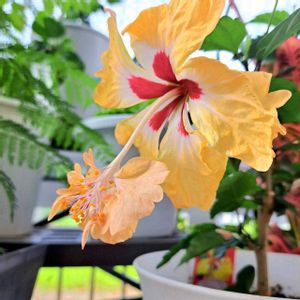 挿し木で増やしたハイビスカスのレモンフラミンゴ、小さな体でけっこう大きな花を咲かせてくれました。