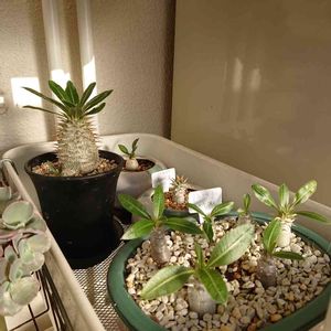 パキポディウム・ブレビカウレ・レウコキサンツム。 恵比寿笑いさん。 去年の5/3にまいた実生さん。 形は様々ですが(笑)