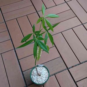 パキラ。 植え替えしました(^-^) ひょろっ子さんですが 実生さんです🎵 札に 2018年 と書いてあるので 2年生ですね。 もぅ少し、ガッチリしてくれると嬉しいな(^-^)