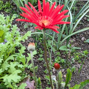 GS今日のお花 ガーベラ🧡 日本ガーベラ(ニホンガーベラ)🧡 昨日(4/17)の 様子です。 増えないです…… (我が家にきて20年近くになります)(2003年頃に❣️) 絶えずに毎年咲いてくれることに感謝しながら 今年もあ・り・が・と・うと 声をかけております💐🧡💐 花言葉 「感謝」 🧡記録🧡 コメント欄閉じてご免なさい🙏🙇♀️ 追記2023年10本❣️ 5/5.13本目の蕾が見えてきました❣️ 6/1.18本 花後のフワフワ~~種みたいです…… 土の中に埋めてみました…… 4/18発明の日