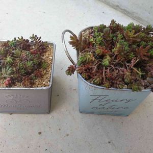 🐮おはようございます🤗💕 メルカリでゲットした多肉ちゃんを、 🐮100均のミルク缶にチマチマ寄せ植え✨ 全部で3つになりました♪ 揃うとまた楽しい💕 センペルちゃんの魅力にも取り憑かれ、ちょっとずつ集め始めました❣️(≧∀≦) 念願のエンジェルフィンガーちゃんも👼✨冬の紅葉が楽しみです♪🙌 でも思ってたエンジェルフィンガーちゃんと、葉っぱの形や色がちょっと違うような❓❓😳このままでも可愛いけど❣️ いつもと違うセンペルちゃんやセダムが入るだけで、何とも可愛い仕上がり✨ 🪴💕ヤッターヽ(*´∀`*) 寄せ植えって、器や苗の組み合わせ方で、表情が変わるのが楽しいし、難しい🤣💕 6月初投稿でした! 今月もよろしくお願いします🤗