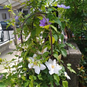 薔薇ブルーフォーユー クレマチス フォンドメモリーズ クレマチス白万重 ようやく同時に咲きました😅 だけど、ブルーフォーユーは元々早咲きが今年はさらに早く、あと数輪しか残っていません。 フォンドメモリーズは白万重よりちょっと早いのだけど、今年購入した2年生でつるが短いので、単体でトレリスに。思ったより大輪ですね。ブルーフォーユーは今年、日よけになっていた樹木を切ってしまったためか、色が濃くなってしまいました。もう少し淡い色が好きだなあ。