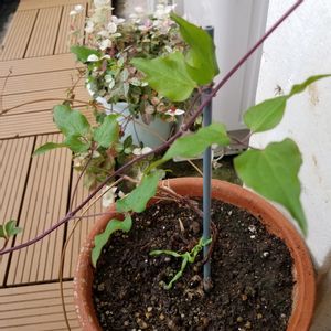 枯らしてしまった~😞 と思っていた クレマチス… 諦め切れずにまたに水をあげていたら新しい葉が少しずつ 出てきたよ~ 何もついてない針金のような茎が1メートルくらいクルクル鉢の周りに巻いてるけど… これはどうしようもないのかな…
