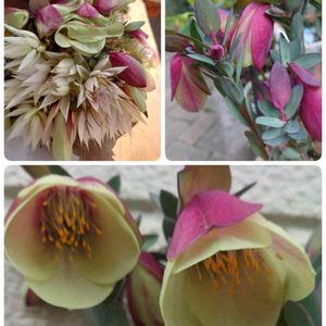 ピメレア ピソデス やっと我が家のピメレア御口あけました〜チューリップ型の花を下げて、、、やっぱり覗いてしまうね🤭✨💕 (左上は、お友達とこで、挿し木するので花だけカットしてセルリアとまん丸にしてたのが可愛くて写メって来ました💗)