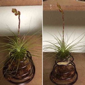 石鹸箱管理が意外に生育が良いので 同じような環境をと 鉢乗せではコロンコロン転がって安定しない壺型の小さな人たちを 夏場はこんな感じで飾って 秋になったらそのまま吊るす作戦を立てました💡 フクシーは小さいコルクに付けて固定してみました DAISOステンレスザルにスタンドを載せて表面をバークチップで覆って シンデレラフィットサイズの鉢受けに水苔を入れて 8時間⏰植物育成ライト🔦に当てて育てます🪴 そのままでは見栄えが悪いのでこんな風に箱庭仕立てにしてみました! 今のところのお気持ち育成ライトの効果ですがブルボーサとカプトメデューサが発根してきましたよ! やはり暑がりさんも温度は控えても太陽光☀️大切なんですね〜🪴