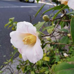 昼散歩で可愛い椿をみつけました。🌸 小ぶりで、白地に薄いピンクのラインが入ってます。💕