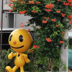 急行電車の乗りかえ駅のホームから見えるノウゼンカズラとPくん!🤩🌿 いつから、そこにいたの?💗